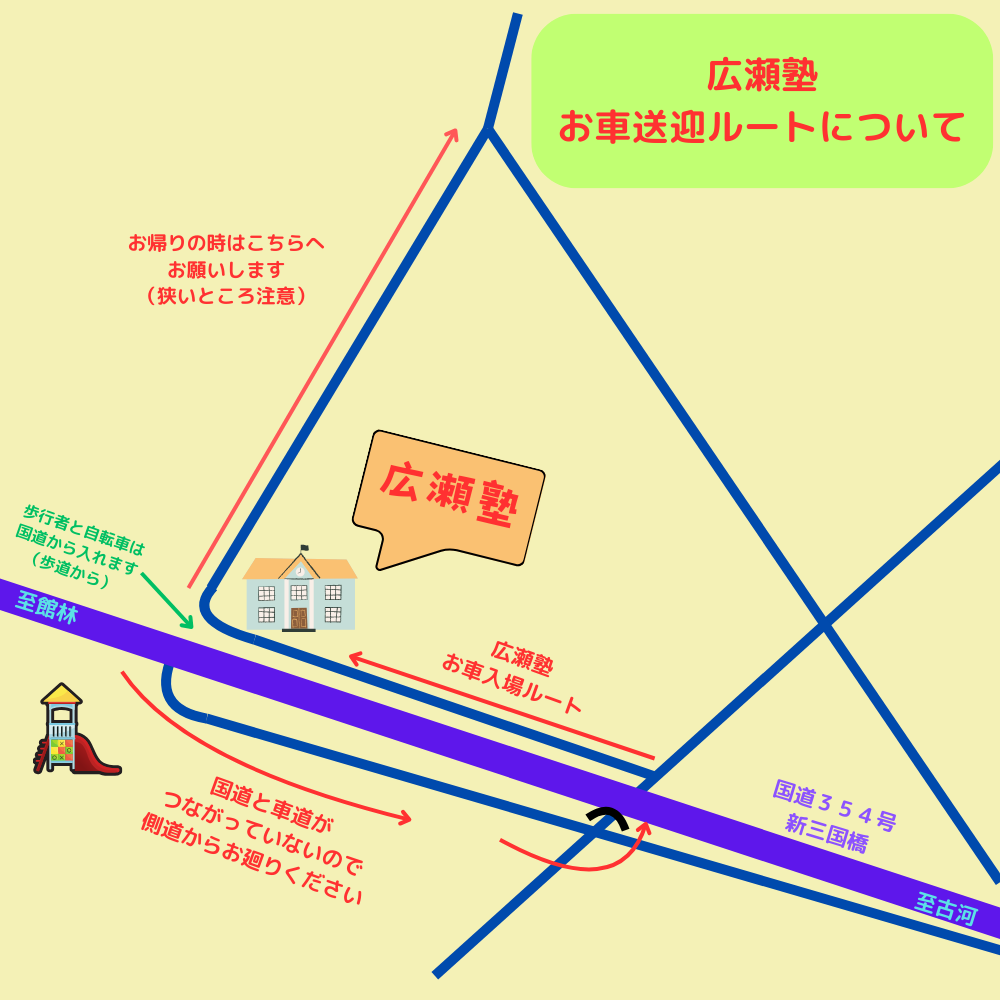 アクセス 2024.03.262024.05.04 広瀬塾への地図です 広瀬塾への地図(Googleマップ) 東武日光線新古河駅より約850mお車でお越しの場合は、国道354号線と直接つながっておりませんので、お手数ですが側道を迂回してお越しください。 お車送迎ルートについて 近隣の道路が狭いため、送迎ルートのご協力をお願い申し上げます。国道354号は、交通量も多いので、お気をつけください。 広瀬塾外観見た目は個人宅です 側道入口南側・塾の反対側新三国橋の始点です 塾の前歩道だけつながってます 帰路の道が狭いのでご注意ください